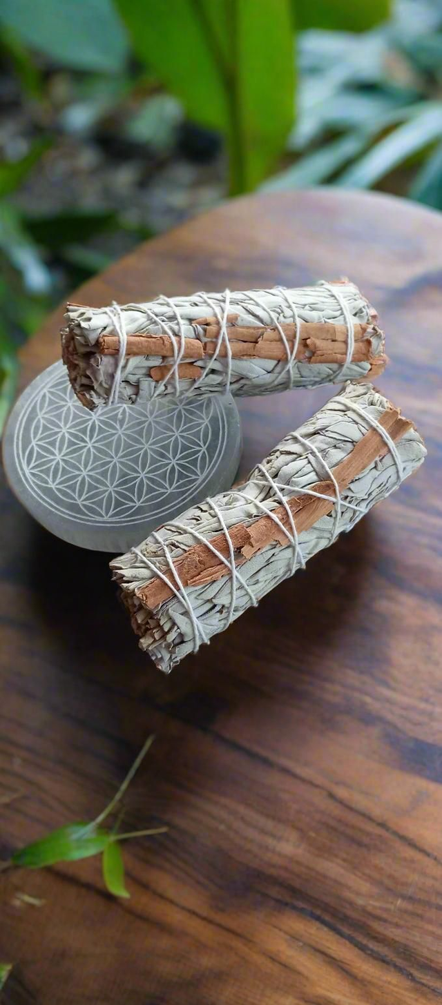La sauge blanche est traditionnellement utilisée pour chasser les énergies négatives et assainir les lieux, tandis que la cannelle apporte une vibration chaleureuse, protectrice et stimulante, favorisant l’abondance, la motivation et le bien-être.